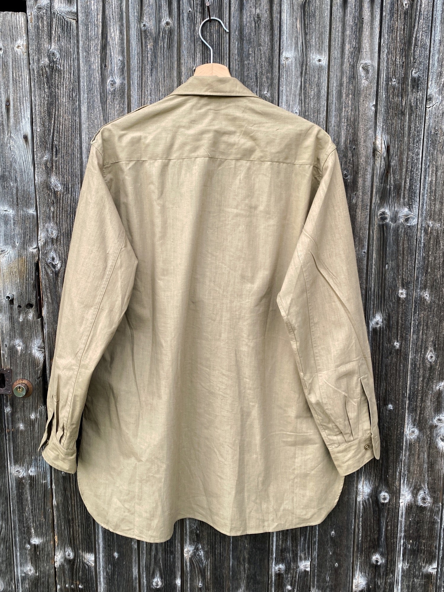 Beautiful fabric, lots of irregularities, typical from the early 50s french army garments. Big open collar, perfect for summer. Straight fit, looks great a little oversized and tucked in for 70s vibe !