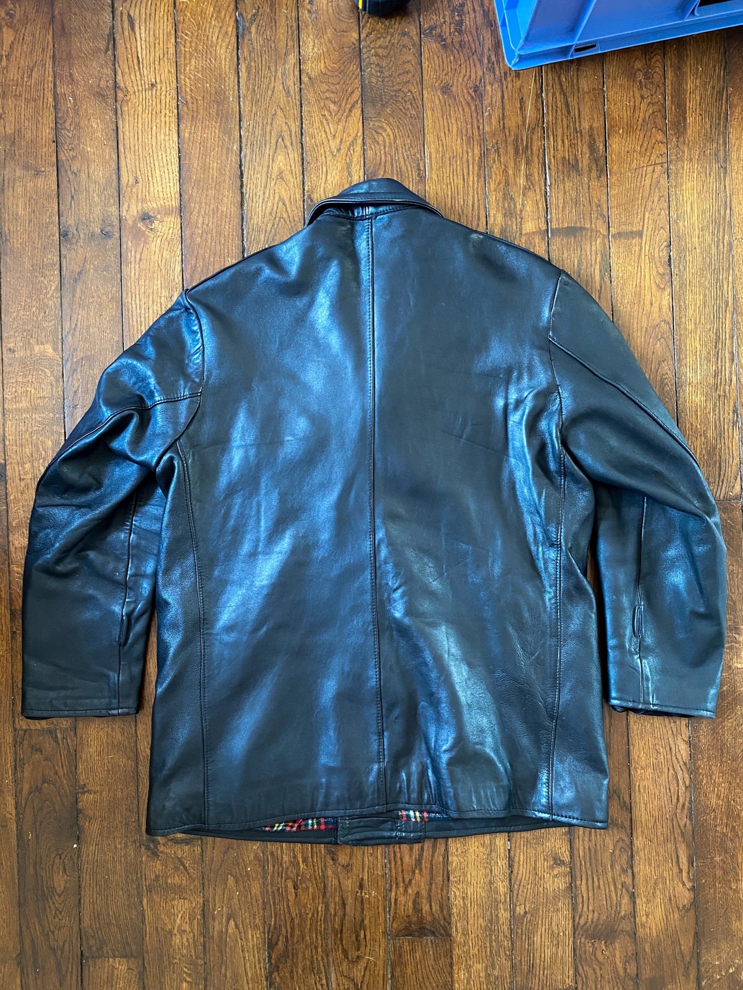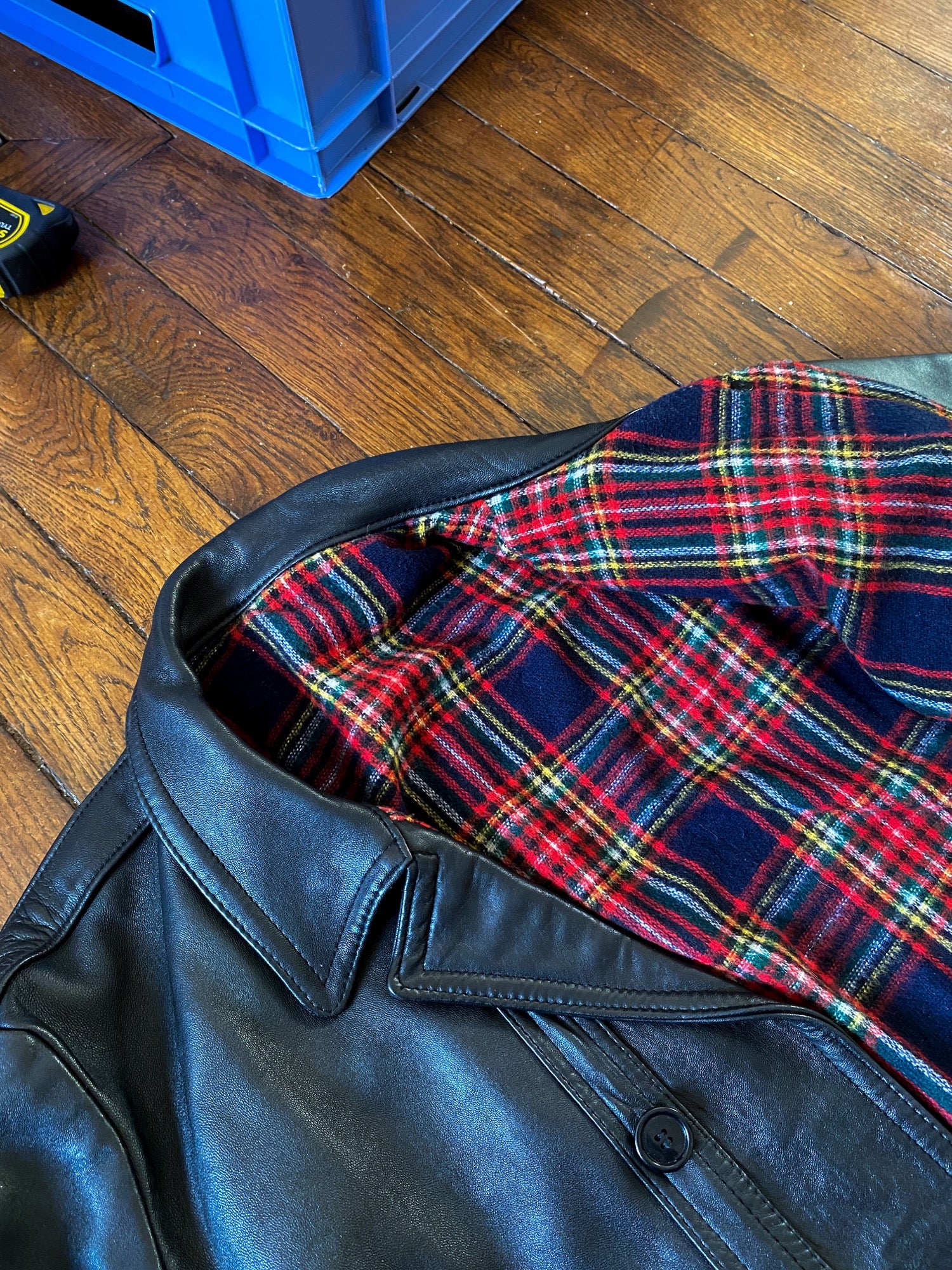 High quality black chrome tanned leather, leather collar, plastic buttons, fully lined with wool and satin fabric in the sleeves.