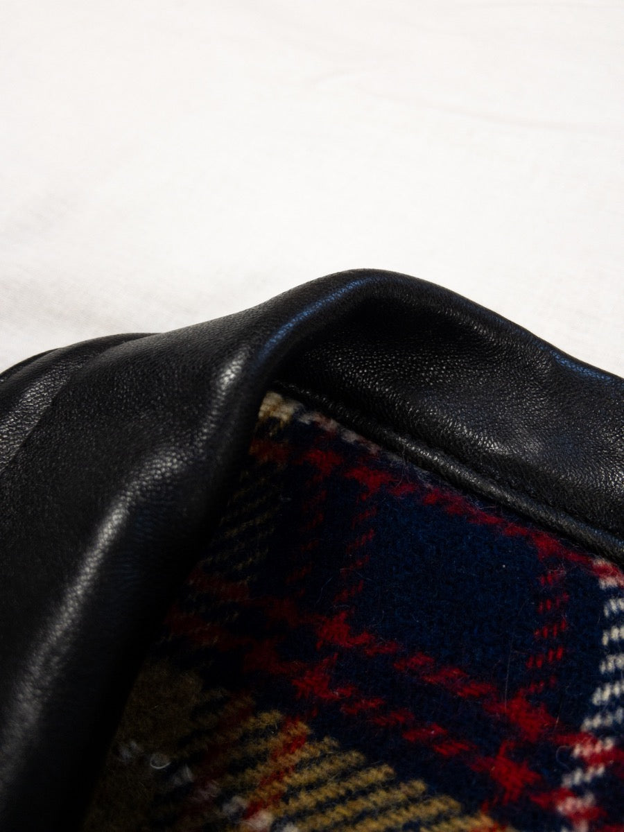 High quality black chrome tanned leather, leather collar, plastic buttons, fully lined with wool and satin fabric in the sleeves.