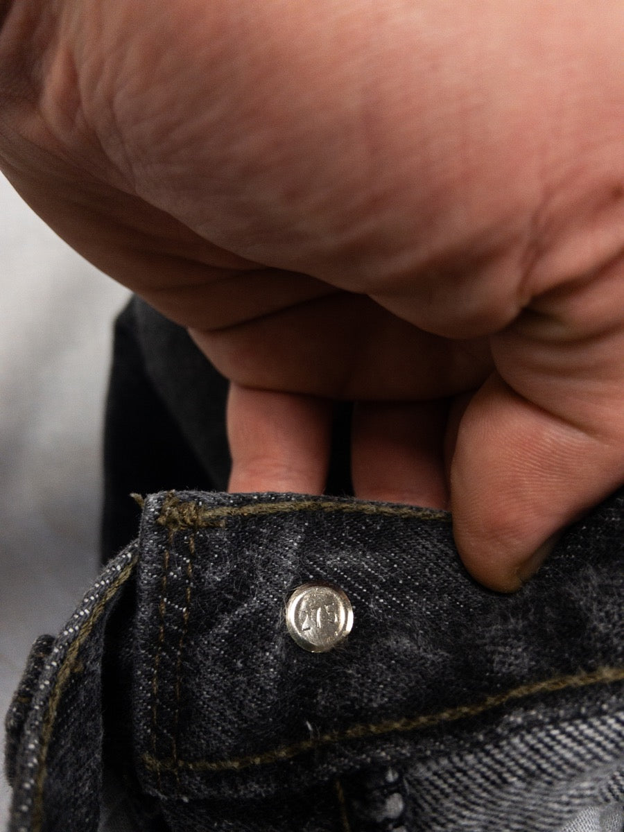 The 901 cut is high waisted with a tapered leg. The fabric is a soft and slightly neppy black cotton denim, slightly faded.
